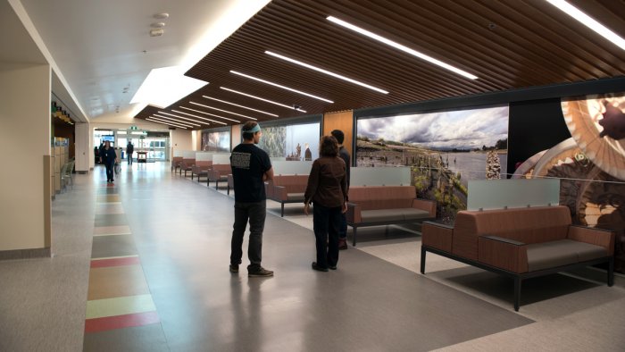 Trees are an integral presence in our communities. Inspired by the importance of the natural world in our lives, the artists created a transitional image matrix that laces together a relational conversation between the surrounding forests and the interior hospital space.