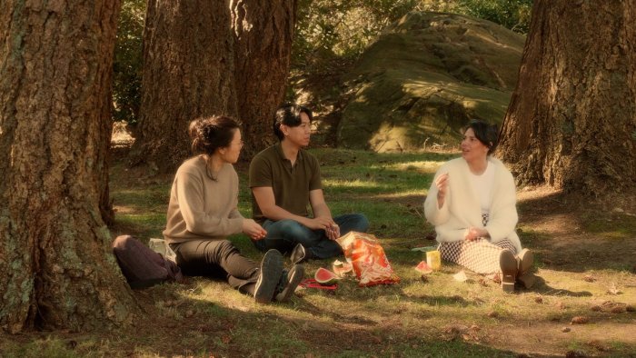 IMAGE: Edited still from Picnic at Government House, featuring artists Chrystal Phan, Lindsay Katsitsakatste Delaronde, and Christian Jones, 2025.