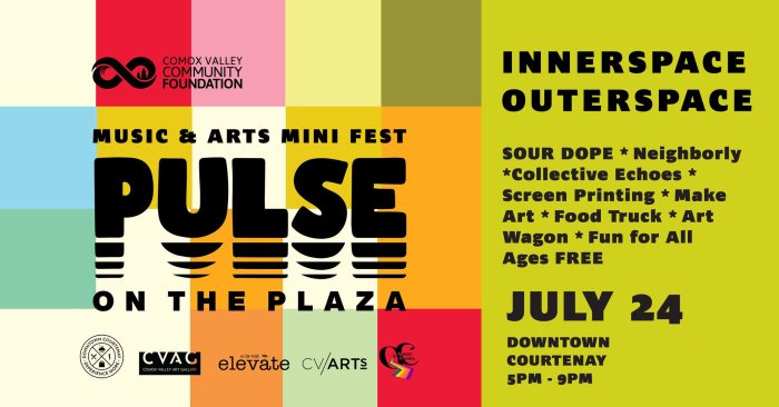 Summer Pulse is organized by Comox Valley Art Gallery, Comox Valley Arts, Downtown Courtenay Business Improvement Association, Elevate the Arts, and Queer Centre Comox Valley with support from Comox Valley Community Foundation.