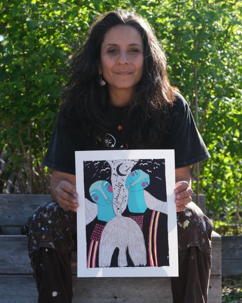 Chantey gratefully lives and makes art in Quw’utsun’ mustimuhw Territory. She is a colour addict, a stargazer, a plant lover, a meal maker, a conscious dancer, and is always on the lookout for delight. Her paintings are an earnest celebration of life. As a first generation Canadian of Indian and Middle Eastern descent, Chantey’s art strikes the viewer through a bold use of colour, shape, and contrast. She is often steeped in poetry, mythology, rhythm, ritual, and the fables of faraway places. This ignites and compels her towards all that is deeply feminine and life-giving. Her process has abstract beginnings, which then gives way to recognizable forms themed on women, nature, and patterns. The result is a juxtaposition of visual playfulness, and serious yet heartfelt content.