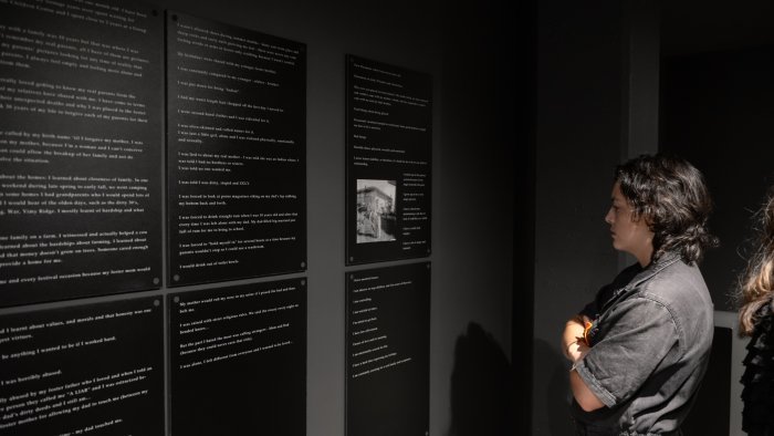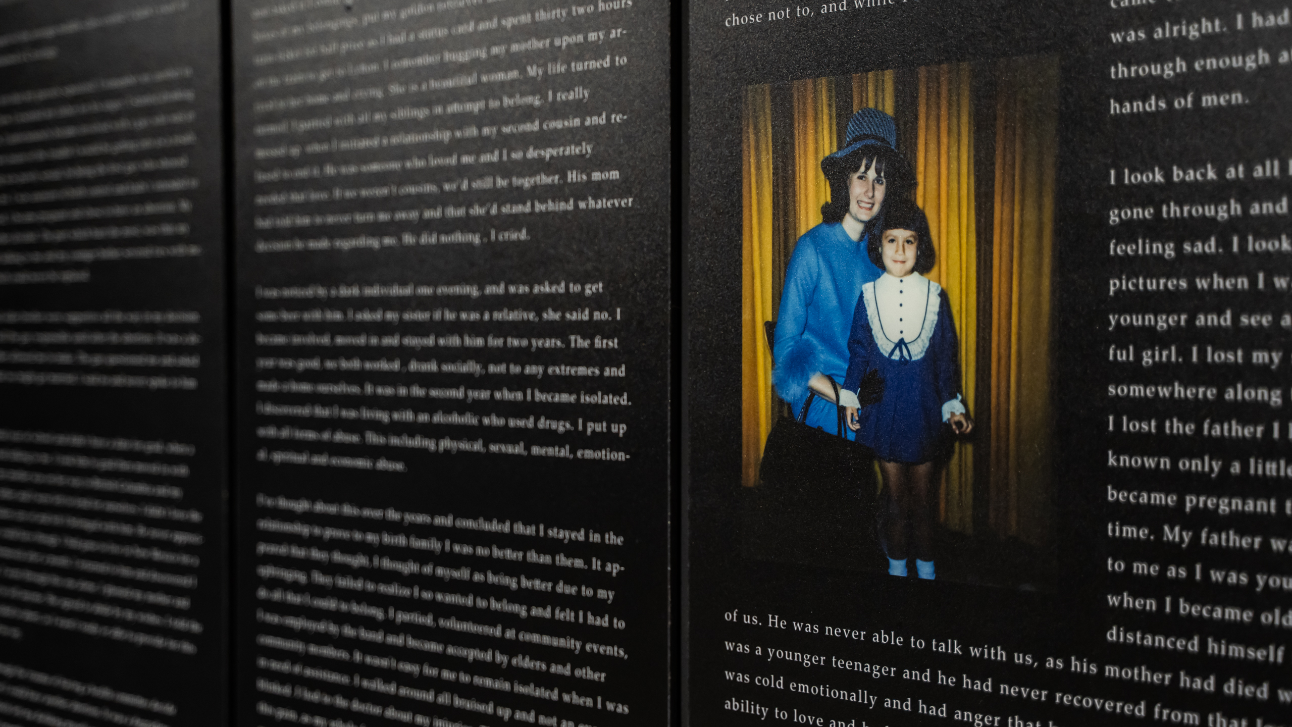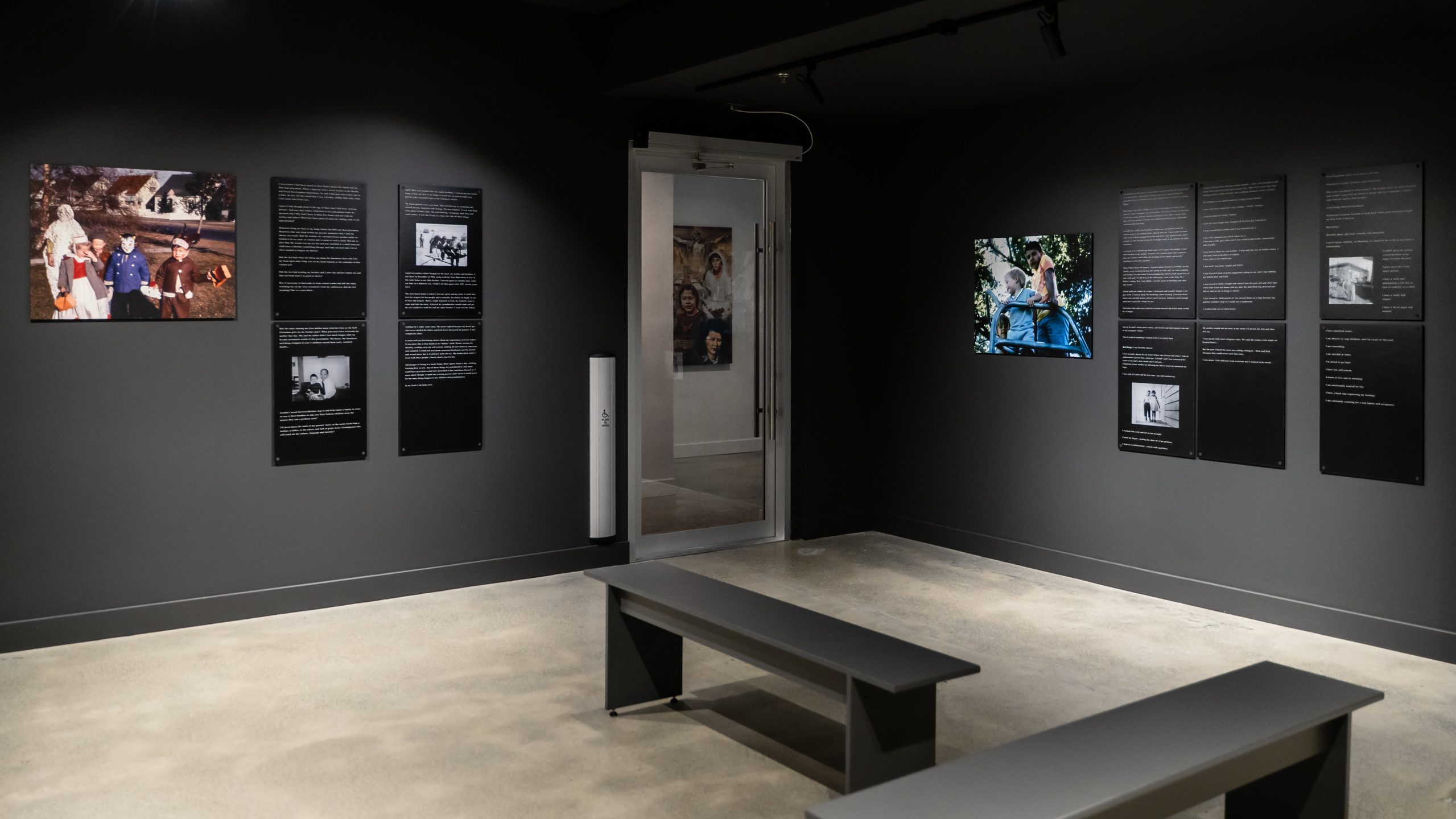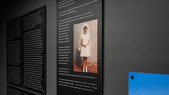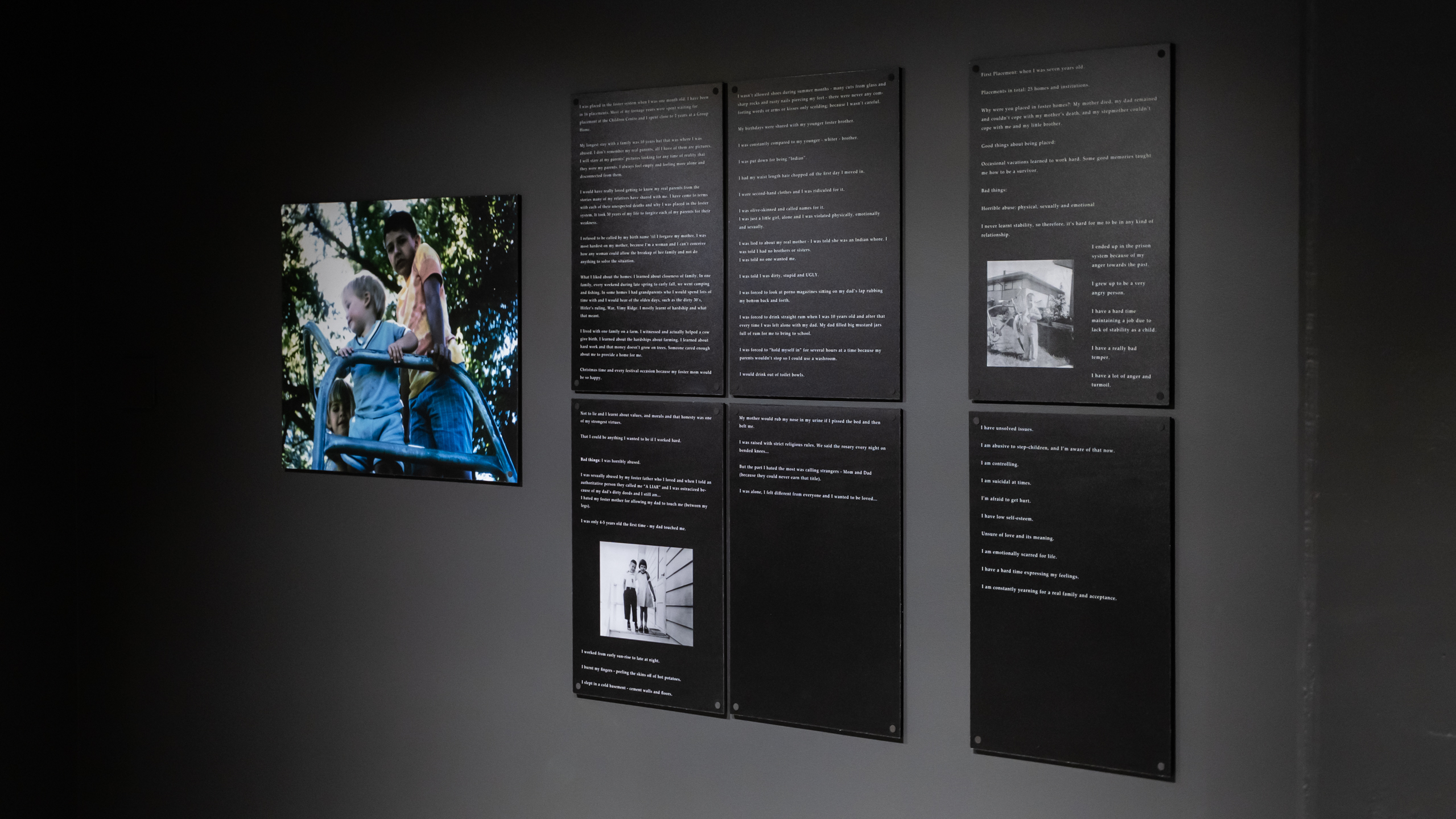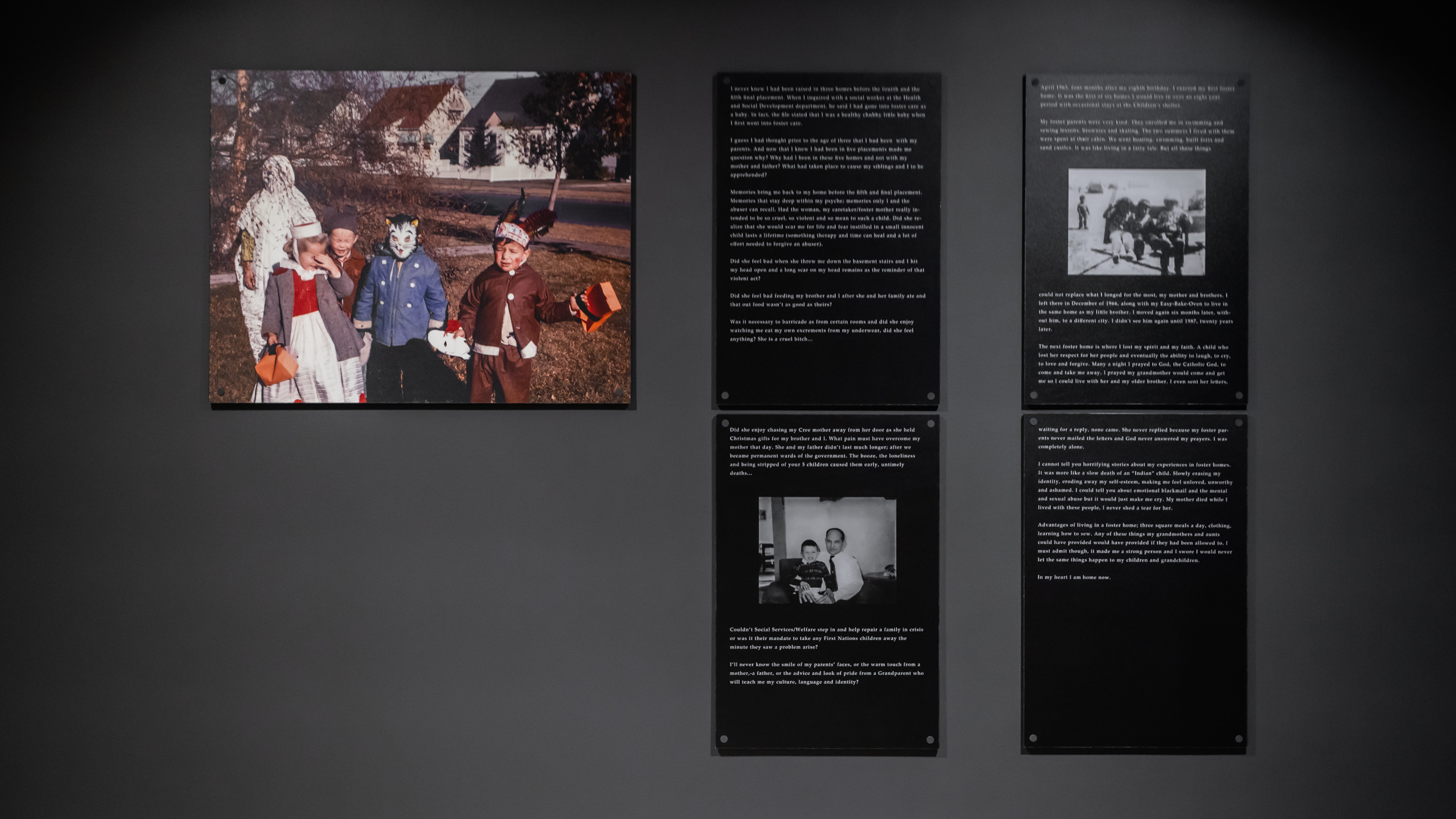 George Littlechild’s exhibition Displaced Indians: The Sixties Scoop shares personal testimonials, which all similarly demonstrate the alienation and confusion that survivors of the Sixties Scoop have grappled with. ”Who am I?” and “where do I belong?” are the recurring questions asked by those who have been displaced.