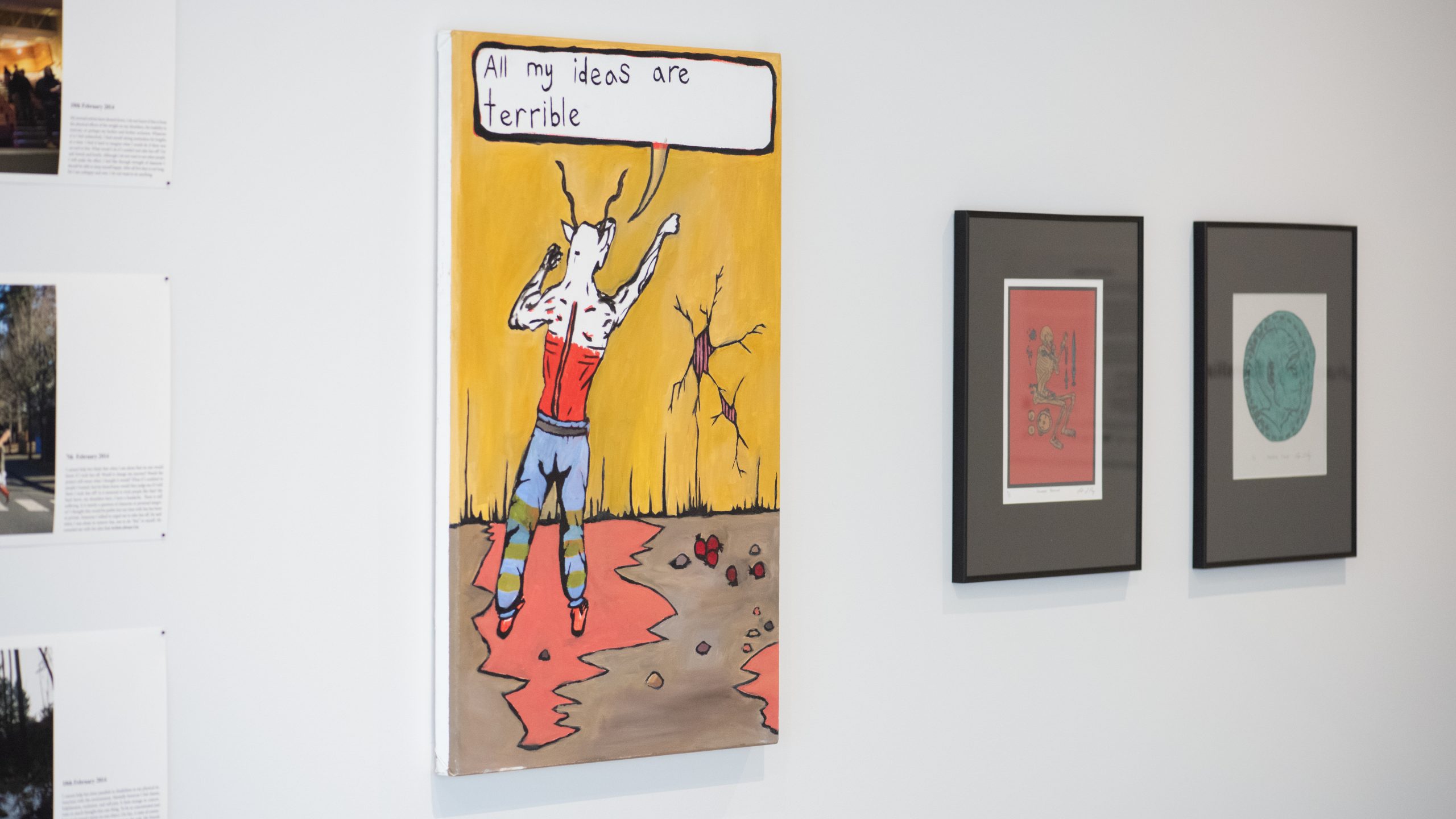 The title Familiars evokes family, intimacy, and demons. Family & Art has been drawn from past artwork and trauma. It stands as an invitation to reflect on relationships. It also serves to show the connecting lines between feelings and the art inspired by them. Familiars has its origins inextricably linked to Family & Art (2021) which was created and distributed as a 31-page zine (mini-publication). This zine was used to demonstrate art as a cathartic process. It was intended to be spread and shared. This zine would eventually become the multimedia video work (1) Family & Art (2023) shown in this exhibition. The multimedia format is a direct extension of the desire to share both intimately and en masse. Artworks (2), (3), (4), and (5) are as much the subjects of both the zine and video, as family and the artist. In many ways the artist statement of Familiars lies within the viewing of (1) Family & Art (2023). In its original format, Family & Art (2021) prompted readers to share their own experiences of pain. In sharing, the process of turning thoughts into artwork becomes clearly seen. This exchange between art and artist became an essential element of the piece. This is continued in (6) by the facilitation of Without Prompting, an artist residency and opportunity for dialogue between audience and artist where viewers are welcome to create, talk, question, and share without any requirement in return. Often, viewers are uncomfortable with the abstraction of ideas. How can the act of sexual assault become a pile of pomegranates? This journey of meaning-making can be daunting and the process feel contrived. Familiars attempts to break down the barriers between image making and meaning and asks you to question the symbols of your own experiences. As a witch with their familiar, how do we too take our demons and make them work for us?