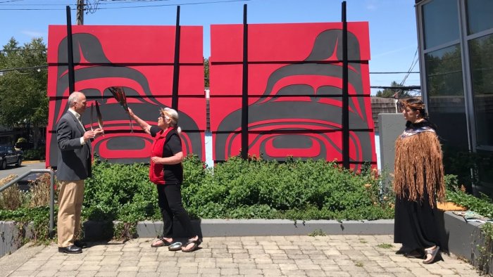 The place-naming component of the project first engaged Andy Everson, First Nations Artist, K’ómoks Cultural Leader and Anthropologist, in 2017 to unearth the significance of the land upon which the CVAG plaza (and downtown core) has been constructed. Andy Everson, K’ómoks cultural leaders, and four Heads of House – Kerry Frank, Allan Mitchell, Ernie Hardy Senior, and Wedlidi Speck, recognized the role of the gallery plaza as a centre-point within the City’s cultural core, its status as a place of welcoming, gathering, and healing, and its significance within K’ómoks culture and unceded territory.