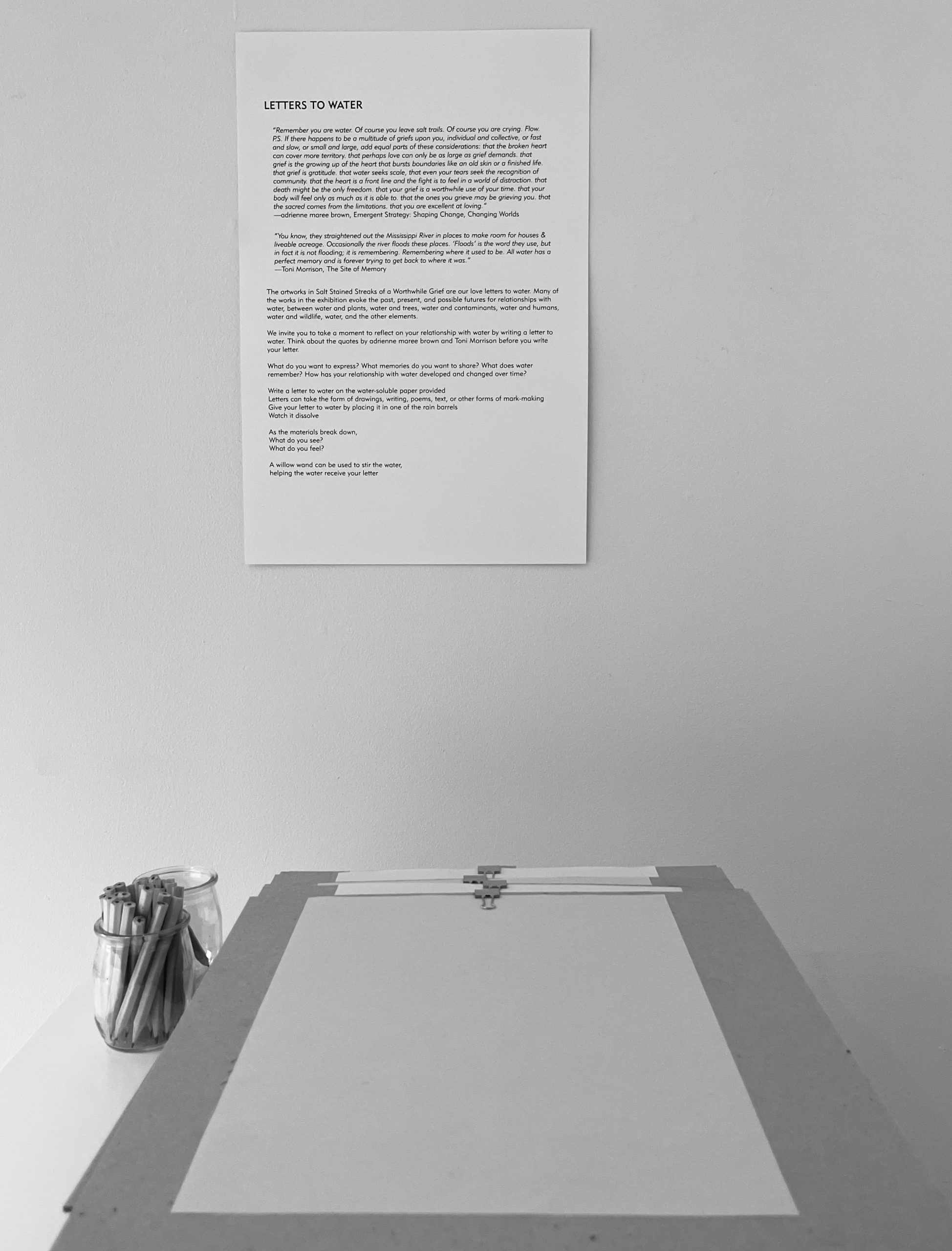 The artworks in Salt-Stained Streaks of a Worthwhile Grief are our love letters to water. Many of the works in the exhibition evoke past, present, and possible futures for relationships with water, between water and plants, water and trees, water and contaminants, water and humans, water and wildlife, water, and the other elements.