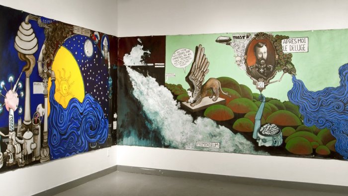 Vancouver BC based artist Ian Forbes (BFA, University of Alberta, MFA, University of Alberta) exhibits The Big Foldy Painting of Death, volume One (an ongoing work). This piece was created on a continuous roll of canvas approximately 127 feet long, and 6 feet in height (the viewer is engulfed inside one large artwork). The acrylic painting is a panoramic, unrestrained and personal narrative using the multiple vocabularies of contemporary art to investigate the destructive qualities of creation and the creative qualities of destruction. Viewers are invited into a “deeply personal conversation about how we are inhabiting this planet, this country, this city, this street, this gallery, this studio”. Here they encounter the provocative juxtaposition of the horror and pleasure of the impending apocalypse; the betrayals and fealties of the aging body and, perhaps, an optimistic hope for apology and reconciliation. In its presentation of multiple, fragmentary concepts and themes, this piece offers an opportunity for viewers to occupy a highly-visceral, contested terrain of emotional experience, and to emerge from this fragmented landscape with new appreciation for that which has, through processes of industrialization and modernization, been lost. Ian Forbes began the Foldy Book of Death series in 2008, after being introduced to the accordion book format.