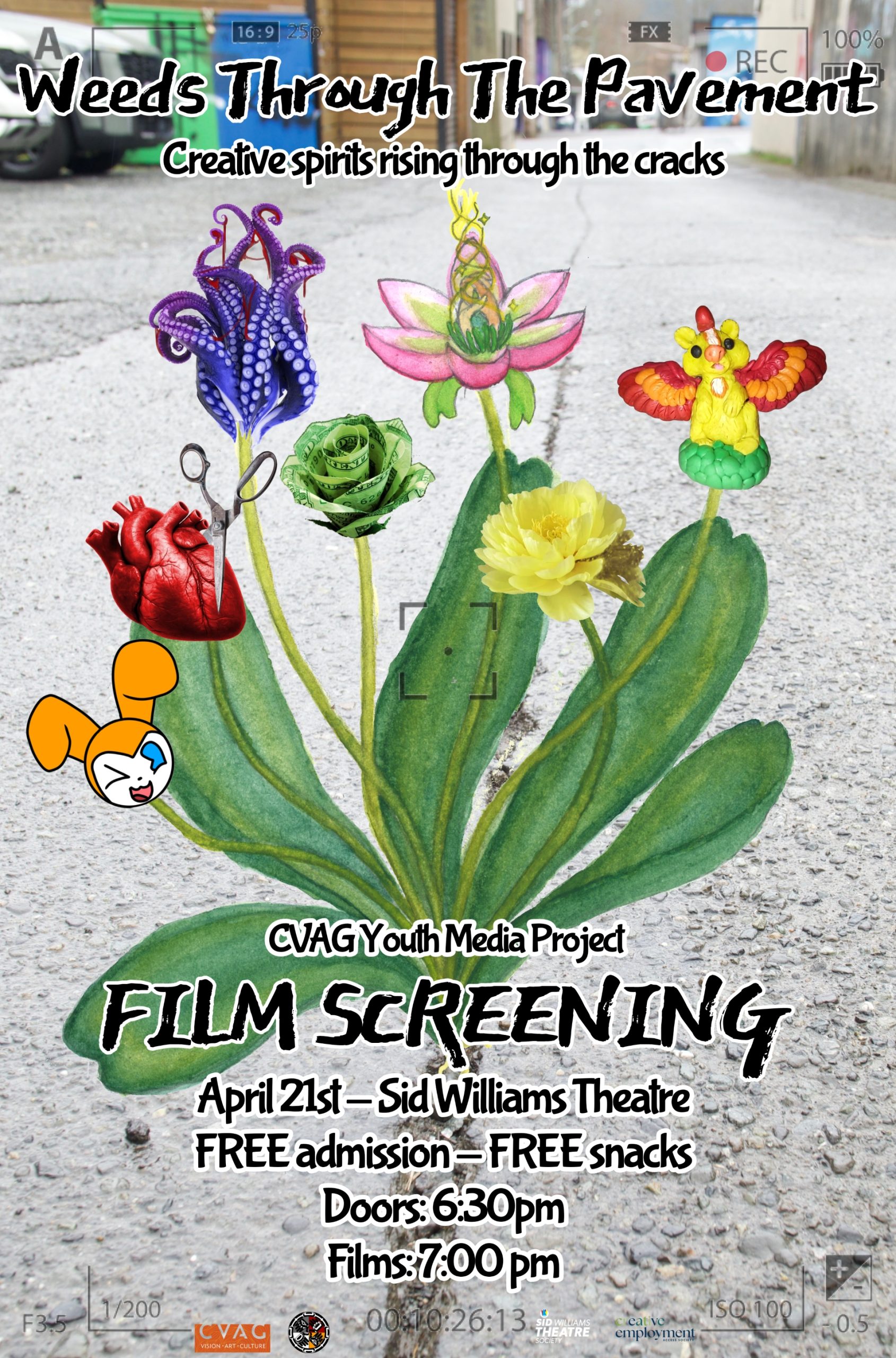 The Comox Valley Art Gallery’s Youth Media Project is excited to present Weeds Through the Pavement, a collection of short films produced by emerging young filmmakers in the recent media training program. Learn more.