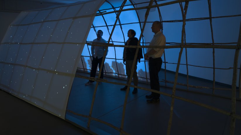 This collaborative new media artwork integrates contemporary and traditional elements.