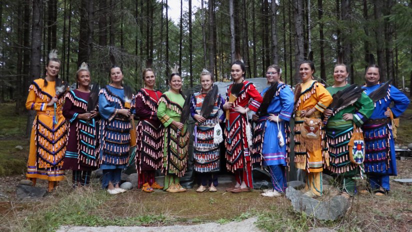 Cultural presenter JoAnne Restoule with IKWE NOOJIM OWIN NIIMI IDIWIN – Women’s Circle Dancers